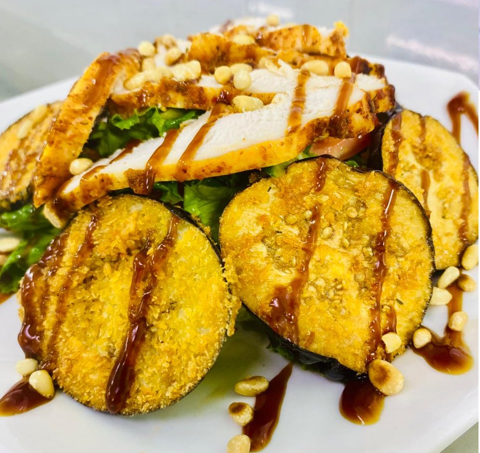 Панированный баклажан в виде рулетиков с майонезом и помидорами, рулетики из кабачков с творожным сыром Cremette, шампиньоны фаршированные с сыром